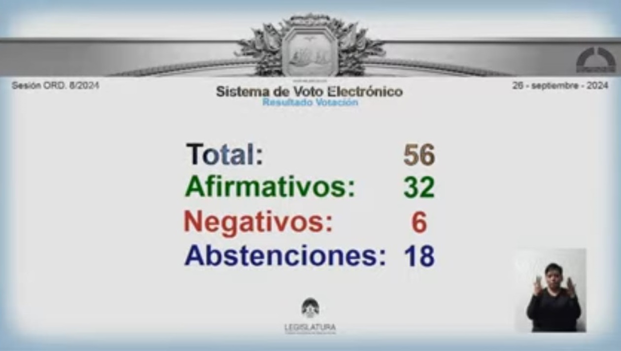 El proyecto obtuvo la siguiente votación: 32 votos a favor (Pro, UCR-Evolución, Socialismo, Confianza Pública, Libertarios de Marra), 6 en contra (FIT y libertarios que responden Karina Milei) y 19 abstenciones (Legisladores del Pro que responden a Patricia Bullrich y UxP)