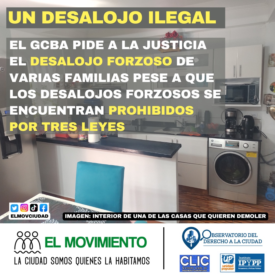 A los pocos días, el GCBA se presentó en la justicia para solicitar el desalojo forzoso de varios hogares con la excusa de que viven en un edificio construido bajo la autopista. La alternativa del GCBA a la relocalización fue el otorgamiento de una vivienda con una habitación para cada hogar. Actualmente cada hogar tiene su unidad funcional en el edificio, pero el GCBA quiere hacinarlos en una sola vivienda.