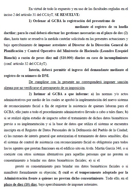 El Juzgado de Primera Instancia en lo Contencioso Administrativo y Tributario N° 6 de la Ciudad de Buenos Aires dictó una medida precautelar ordenando al Gobierno de la Ciudad de Buenos Aires (GCBA) que garantice un método de registro de asistencia alternativo para un empleado público que se negó a entregar sus datos biométricos faciales.