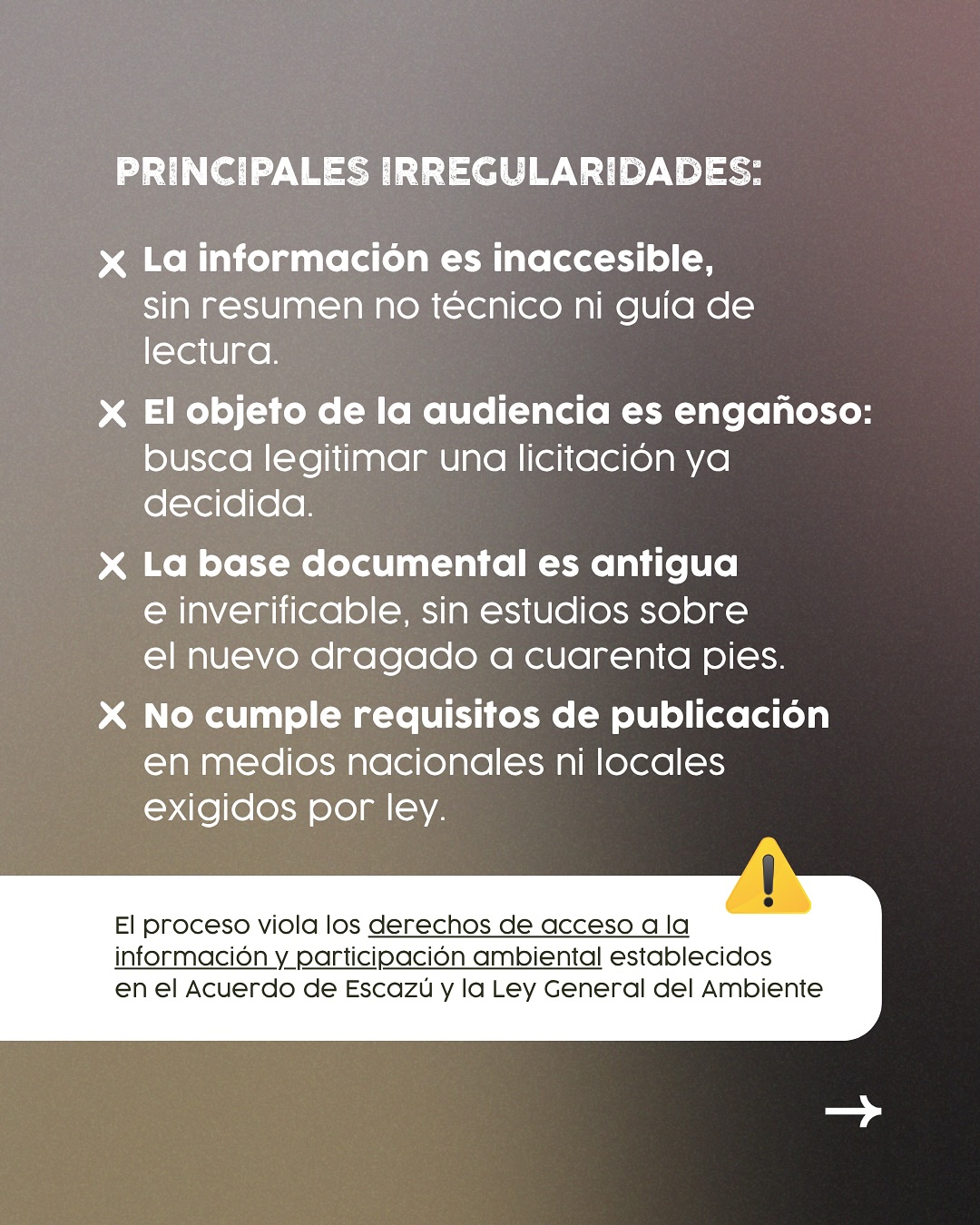 El objeto de la audiencia es engañoso: La Agencia Nacional de Puertos y Navegación (ANPYN) reconoce que el “objeto piramidal” de la audiencia pública es aprobar la documentación licitatoria con vistas a adjudicar la concesión de la Vía Navegable Troncal a largo plazo a operadores privados, “sin aval del Estado”. Esa formulación explícita convierte a la audiencia en un trámite legitimador de la decisión de avanzar en la licitación, desplazando su finalidad participativa.